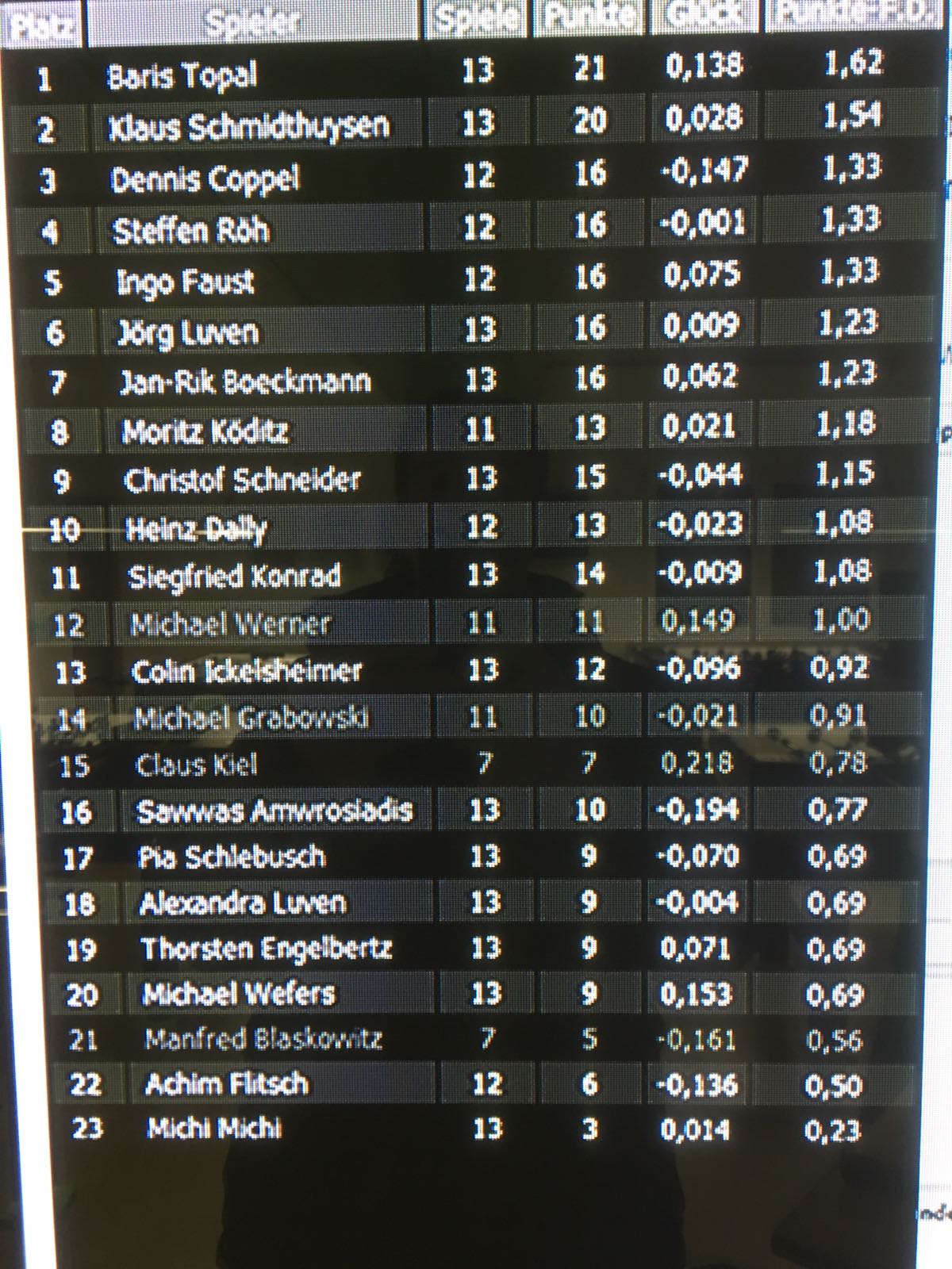 Schlag auf Schlag ging es diesmal beim Monster-DYP. Mit dem jüngsten Zuwachs in unserem Vereinsheim – einem fünften Tisch – beschleunigte sich der Ablauf merklich, so dass den 22 Spielern kaum Zeit zum Verschnaufen zwischen den Runden blieb. Dank den neuen Ullrich-Tisch, der netterweise von der Sparkasse Duisburg gesponsort wurde, wurden 13 statt der sonst üblichen ca. 10 Runden möglich.