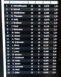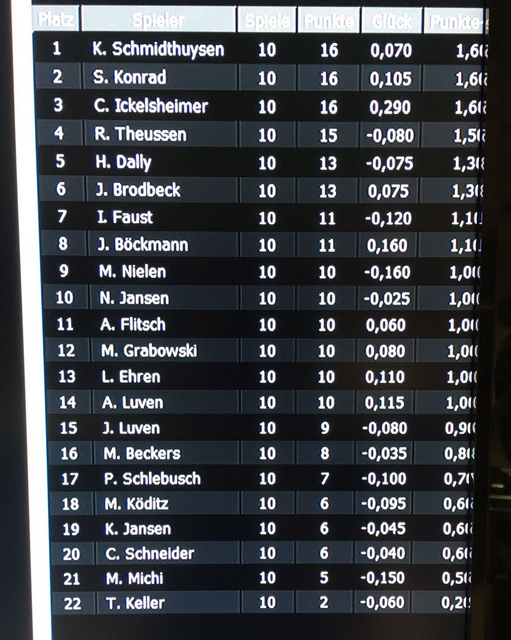 Um kurz nach 12 und 10 gespielten Runden standen die Platzierungen fest: Den Sieg konnte sich Klaus Schmidthuysen mit 16 Punkten sichern. Hinter ihm landeten Siegfried Konrad und Colin Ickelsheimer.