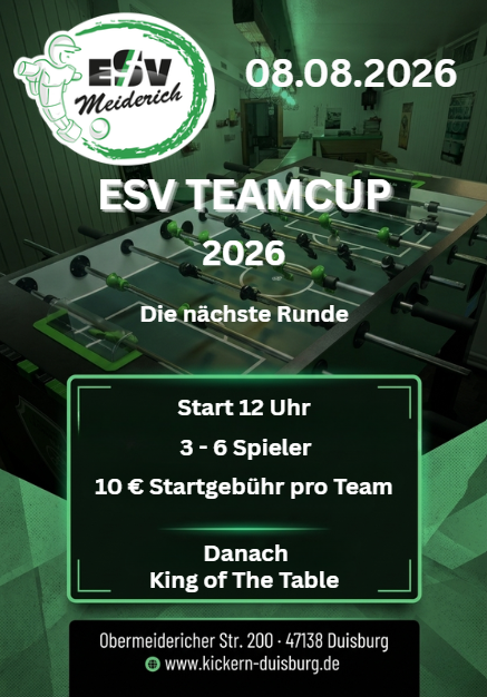 Willkommen auf der Internetpräsenz des ESV Meiderich. Alle Informationen über Tischfussball in Duisburg auf einen Blick. Bootshaus Open 2022 der weltrekord News Bootshaus Open 22 Challenger Offenes-Doppel point Die „Bootshaus Open 2022“, das erste Challenger des DTFB in Meiderich! Weiterlesen M-Dyp 05/22 Challenger Monster-DYP point Am 06.05.22 kamen 11 Spieler ins Bootshaus um das Monsterdyp im Mai zu spielen. (mehr …) Offenes Doppel 02/22 point Zum 1. Doppel der Saison 2022 trafen sich 6 Teams im Bootshaus. (mehr …)